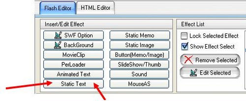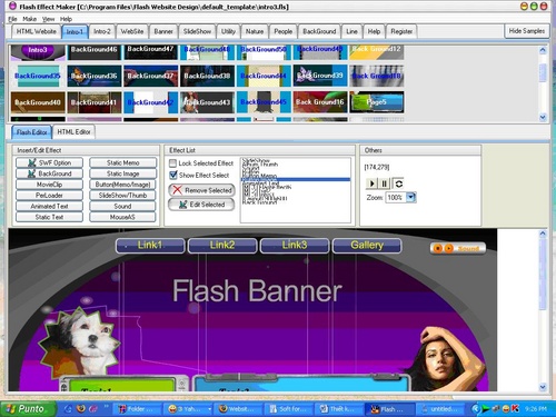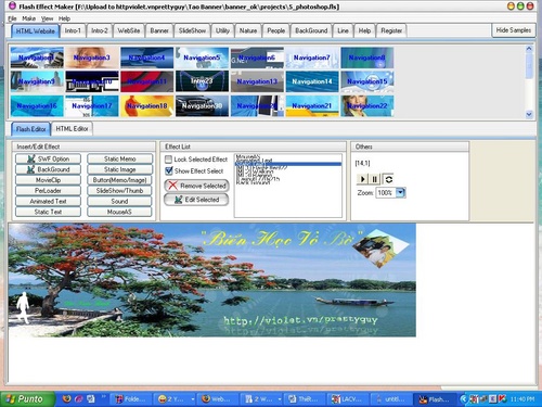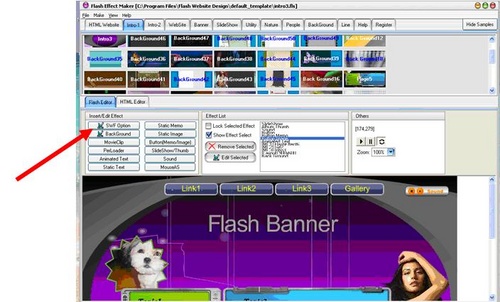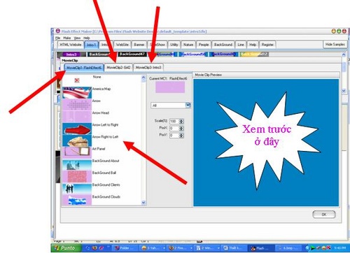 Cửa sổ tuỳ chỉnh hiệu ứng xuất hiện. Ta có thể chèn 03 hiệu ứng cho Banner trong 3 mục MovieClip FlashEffect 1, MovieClip FlashEffect 2, MovieClip FlashEffect 3. Bạn bấm vào từng mục rồi chọn hiệu ứng bên dưới và có thể quan sát trước hiệu ứng ở cửa sổ Preview bên phải.