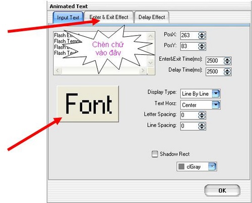 Xuất hiện cửa sổ: Bạn soạn chữ cần chèn rồi bấm vào Font để chọn màu chữ, font chữ, cỡ chữ vv…, bấm vào Enter & Exist Effect để chọn hiệu ứng cho chữ.