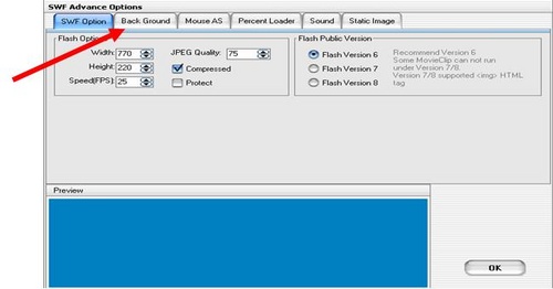 Sau khi tuỳ chỉnh xong tất cả các mục trong SWF Option bạn bấm OK và cửa sổ Preview sẽ cho bạn thấy trước “tác phẩm “ của mình. Trông Banner vẫn còn thiếu cái gì đó phải không? Tiếp theo ta sẽ chèn hiệu ứng cho hình nền. Bạn bấm vào Movieclip.